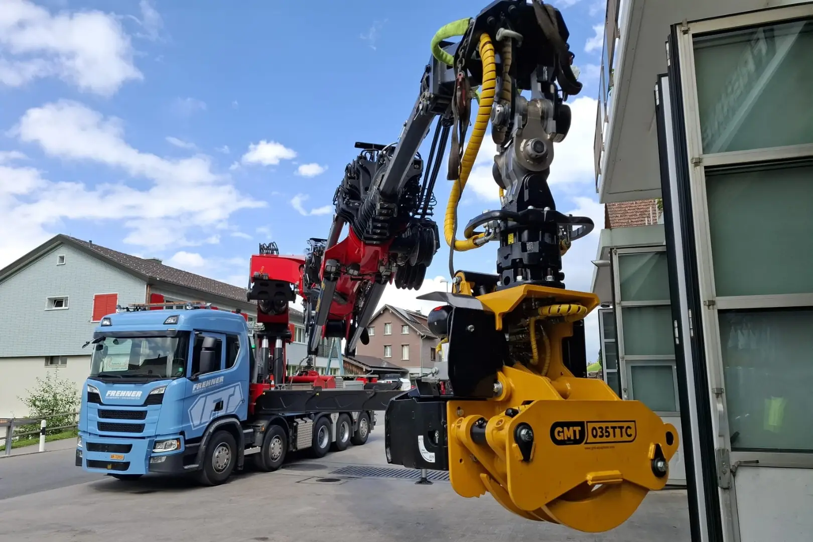 Ein spezieller Kranaufsatz greift Stamm oder Äste, hebt diese an und setzt sie sicher ab. Dadurch lassen sich Bäume auch auf engem Raum präzise und sicher entfernen.