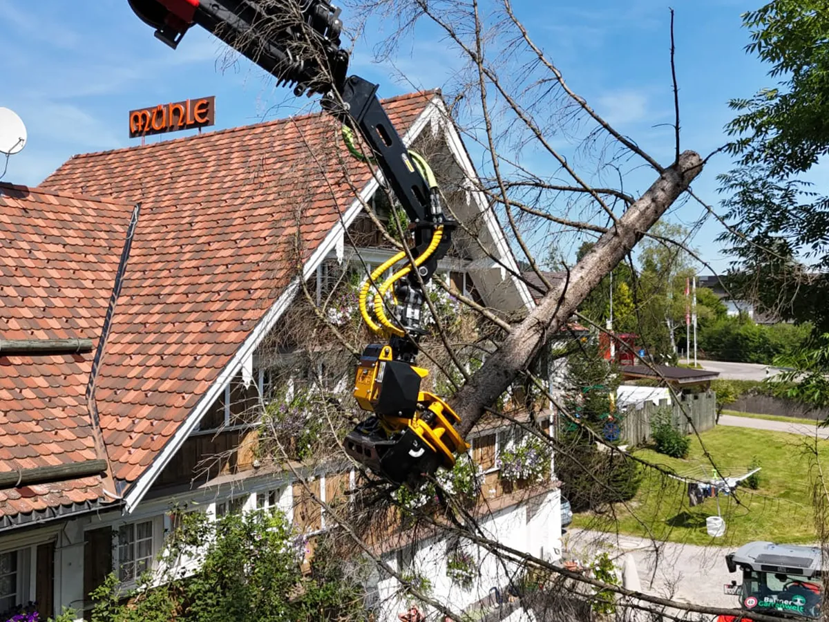 Dank spezieller Kranaufsätze können Bäume kontrolliert, stückweise und sicher gefällt werden – selbst dort, wo herkömmliche Fällmethoden an ihre Grenzen stoßen.